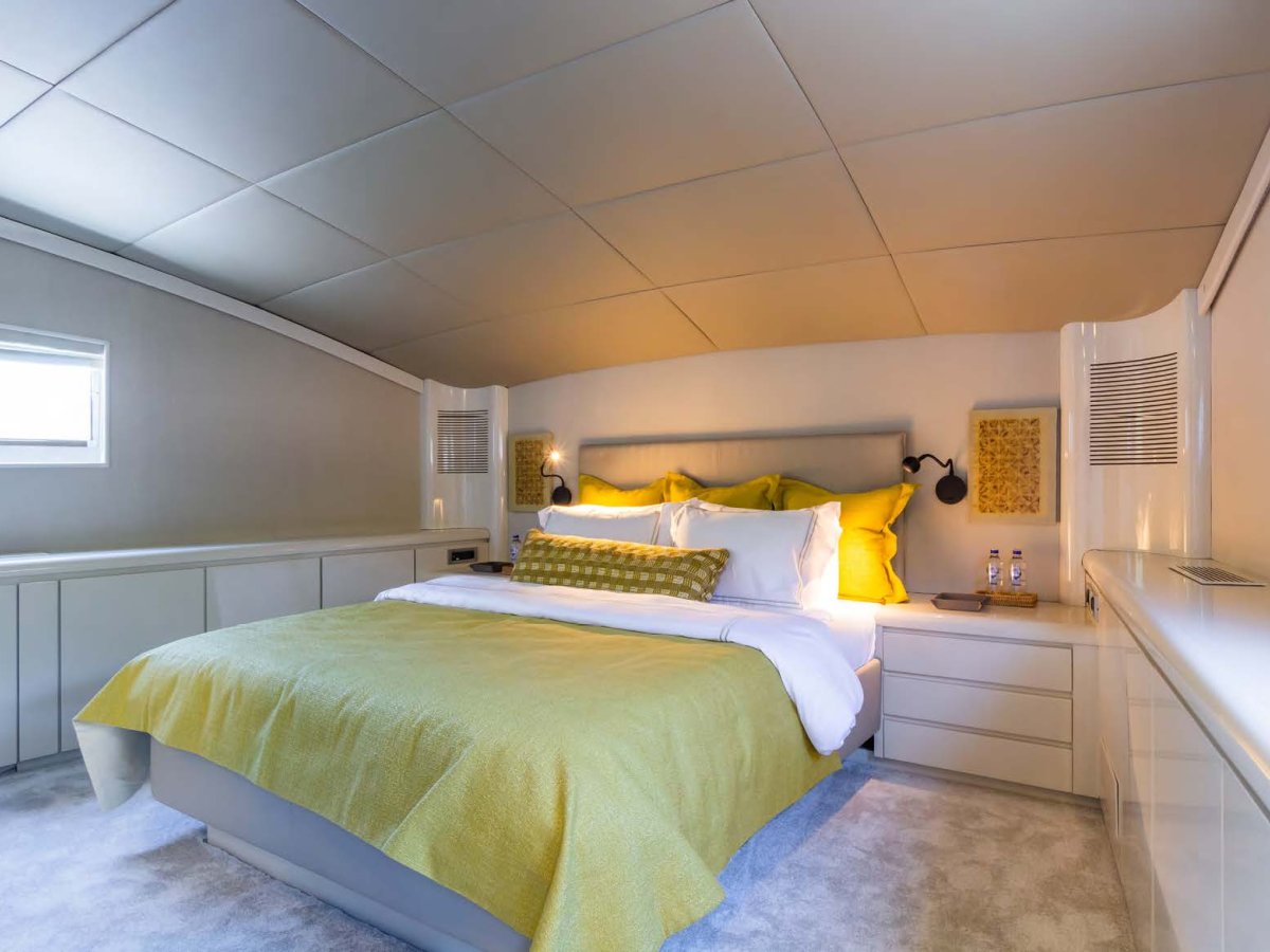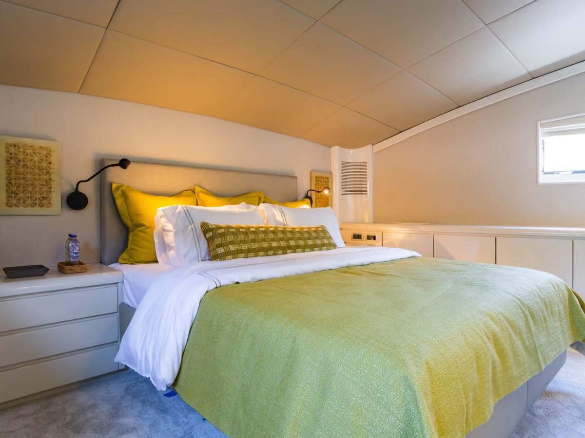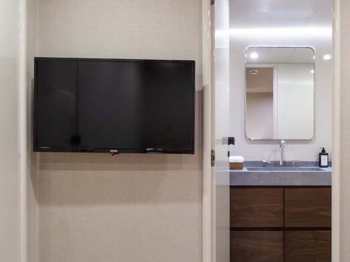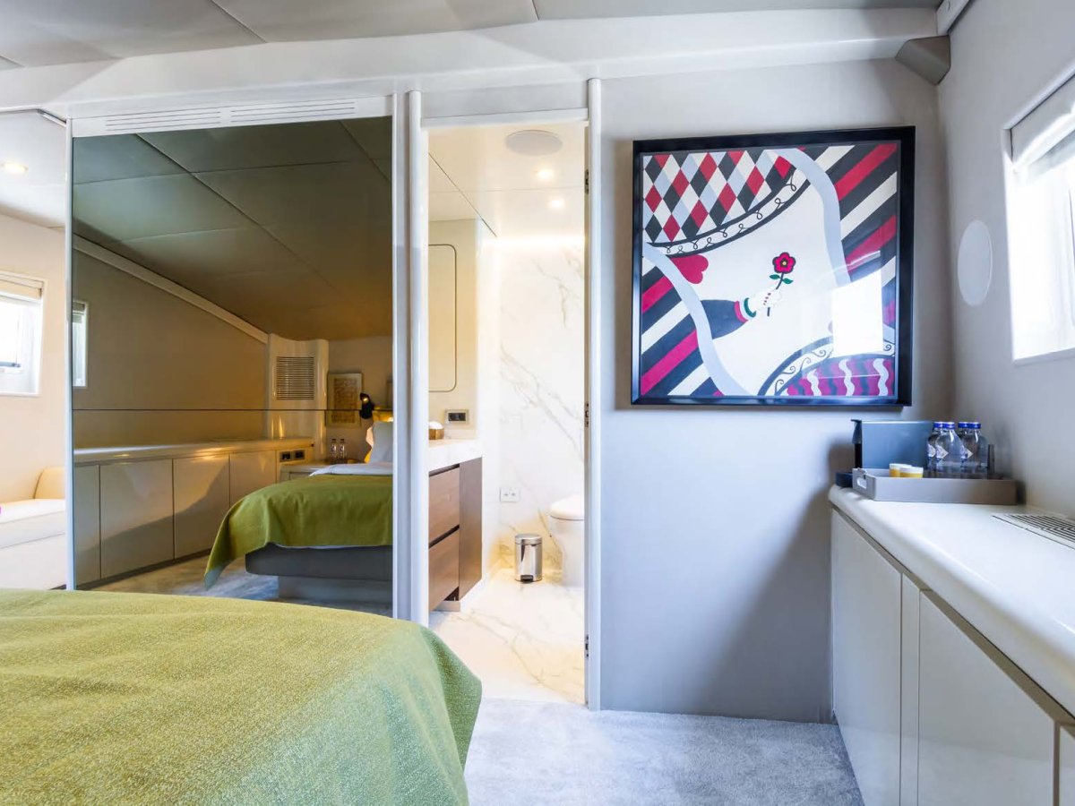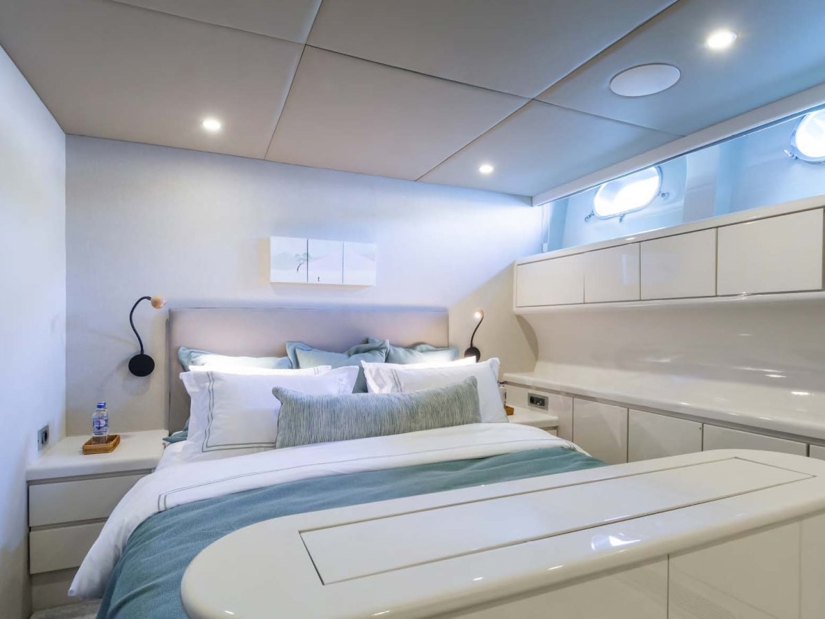 AXELLA accommodates up to 10 guests. The master stateroom is located on the main deck and consists of queen bed, chaise lounge, 65-inch mirror TV and marble ensuite.
