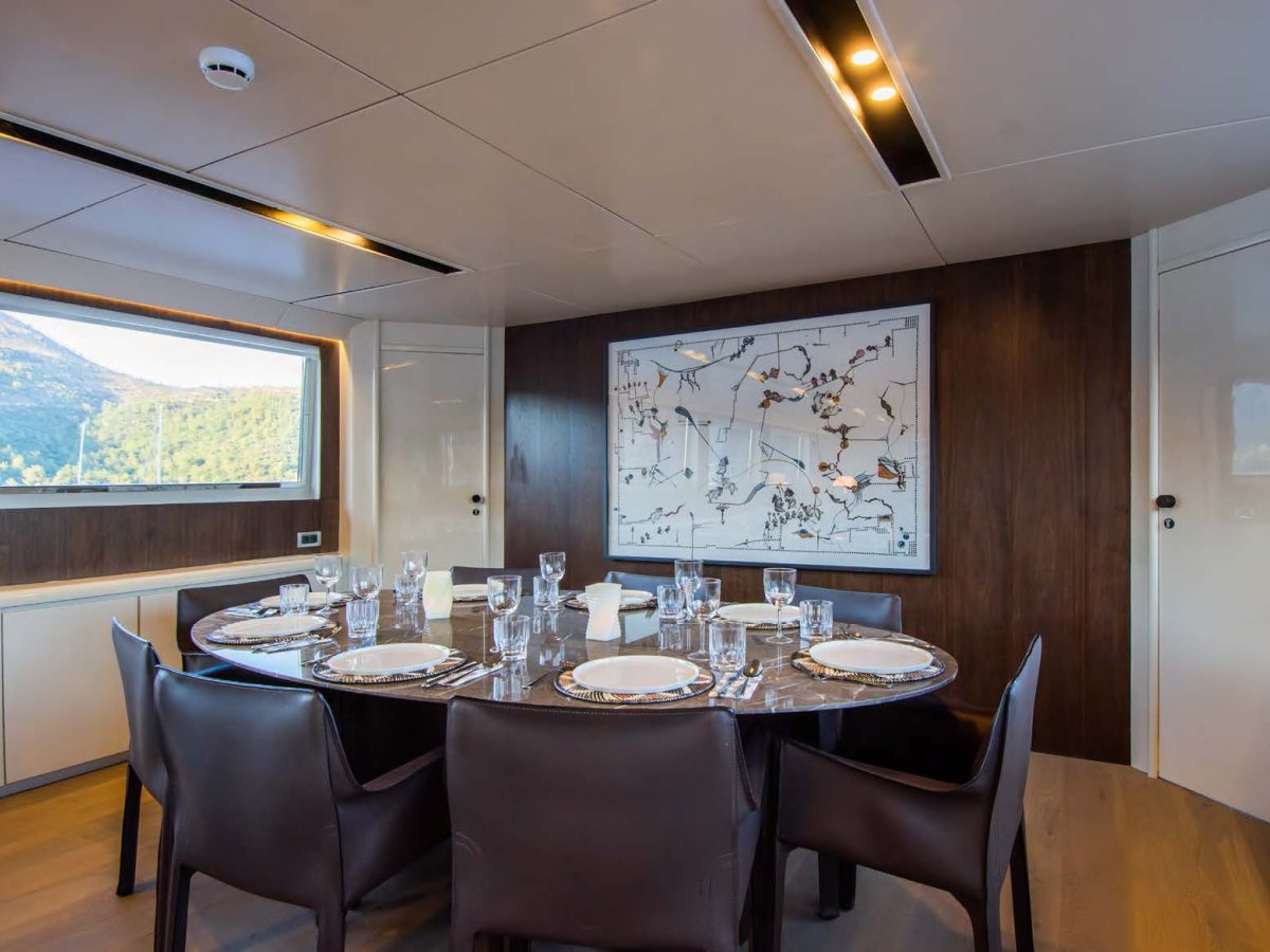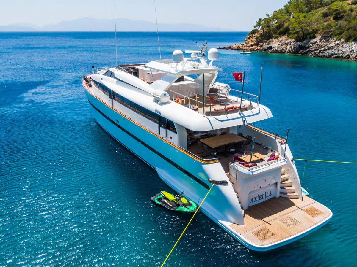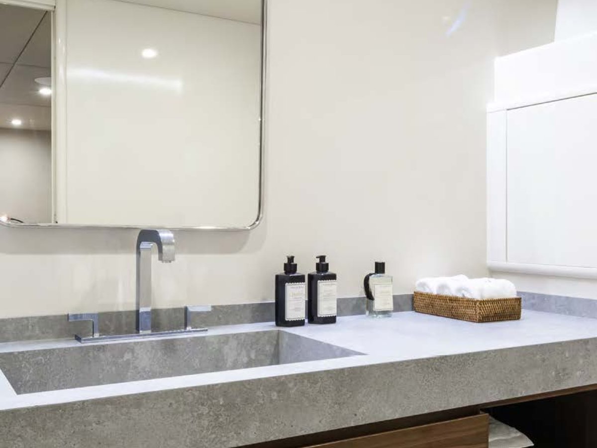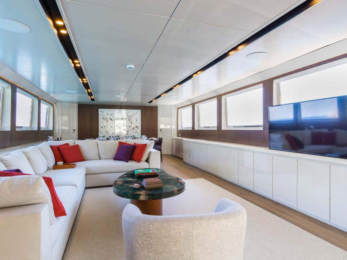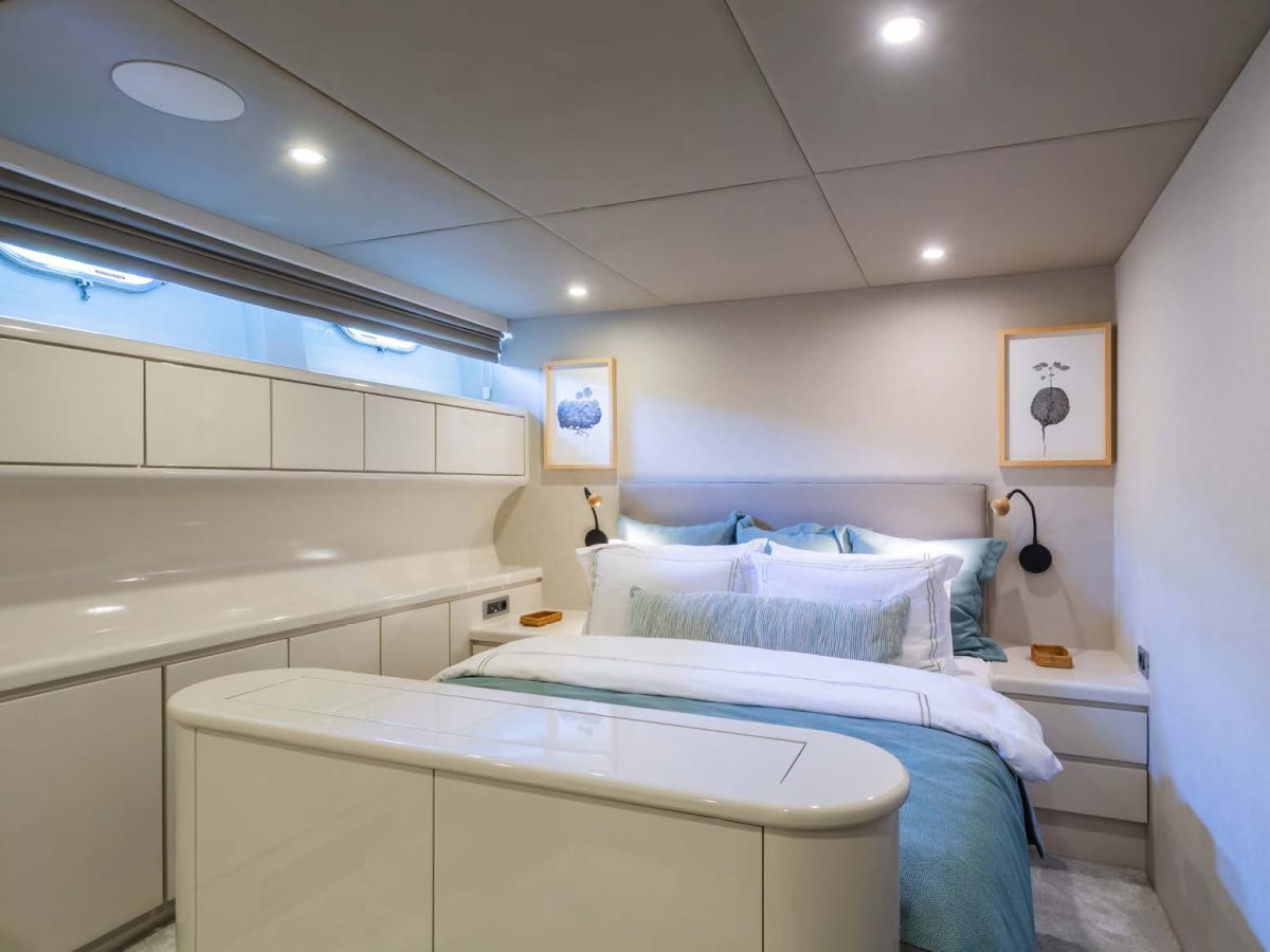 AXELLA accommodates up to 10 guests. The master stateroom is located on the main deck and consists of queen bed, chaise lounge, 65-inch mirror TV and marble ensuite.