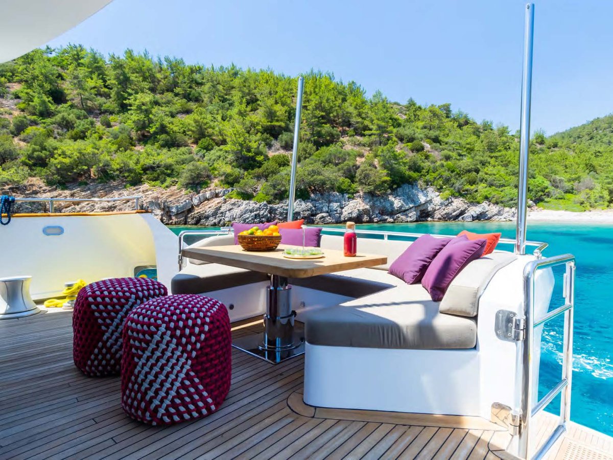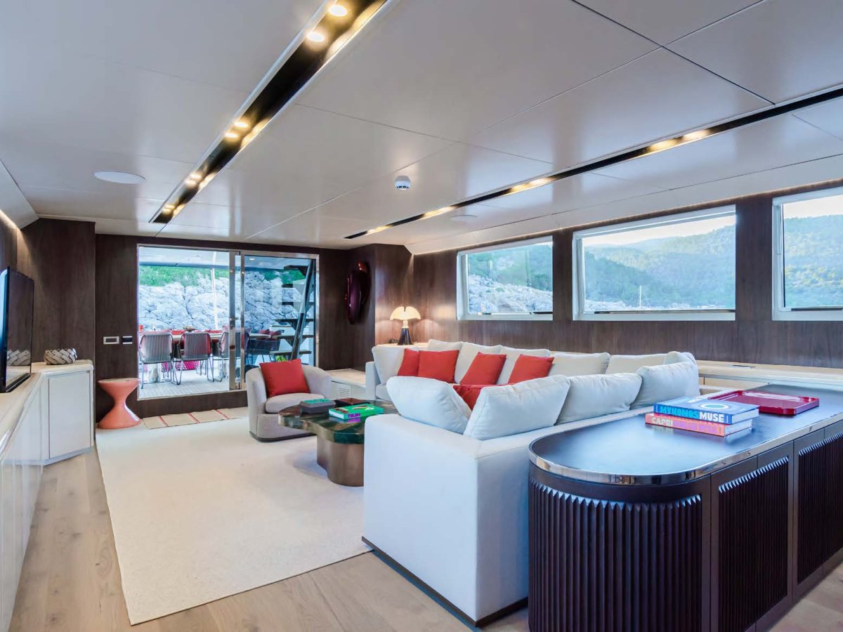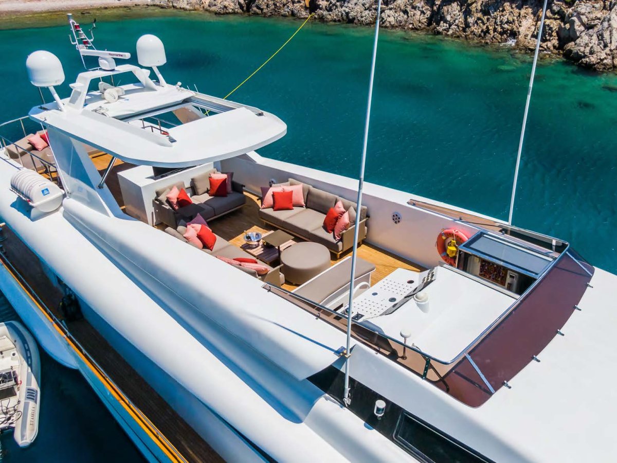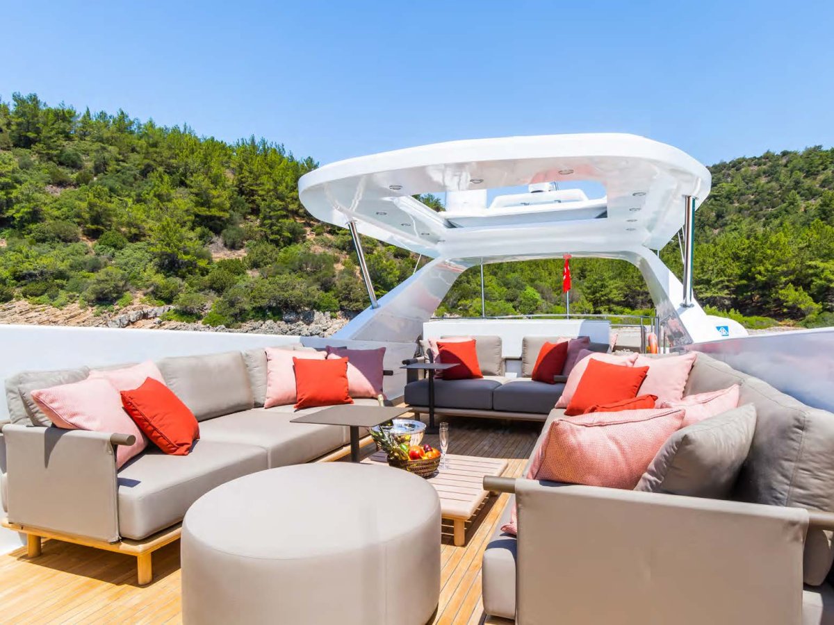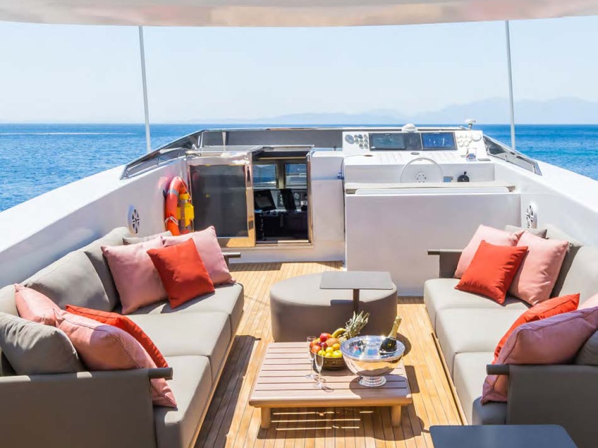 AXELLA accommodates up to 10 guests. The master stateroom is located on the main deck and consists of queen bed, chaise lounge, 65-inch mirror TV and marble ensuite.